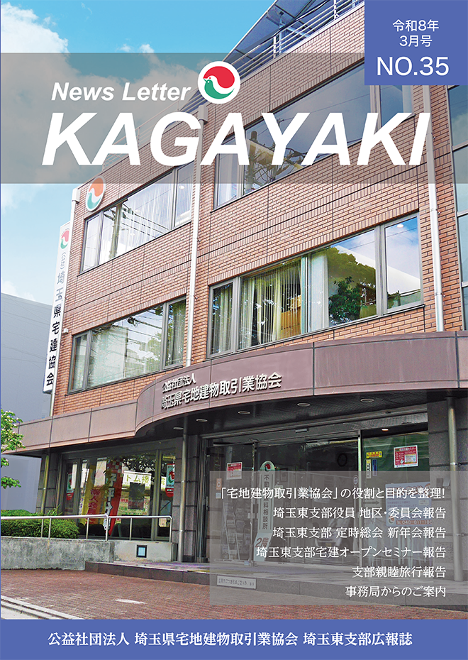 2026年3月6日 / 最終更新日 : 2026年3月6日 takukenhigashi 第35号 令和8年3月 「輝」「宅地建物取引業協会」の役割と目的を整理! 広報誌NO35 (令和8年3月発行) 「宅地建物取引業協会」の役割と目的を整理! 埼玉東支部役員 地区・委員会報告 埼玉東支部 定時総会 新年会報告 埼玉東支部宅建オープンセミナー報告 支部親睦旅行報告 事務局からのご案内 広報誌NO35を見る